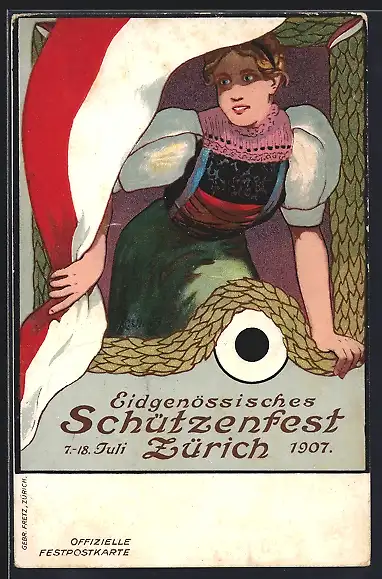 AK Zürich, Schützenfest 1907, Dame in Tracht am Fenster