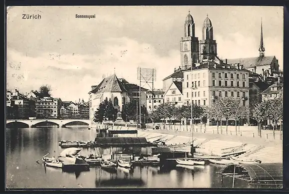 AK Zürich, Sonnenquai, Ruderboote, Kirche