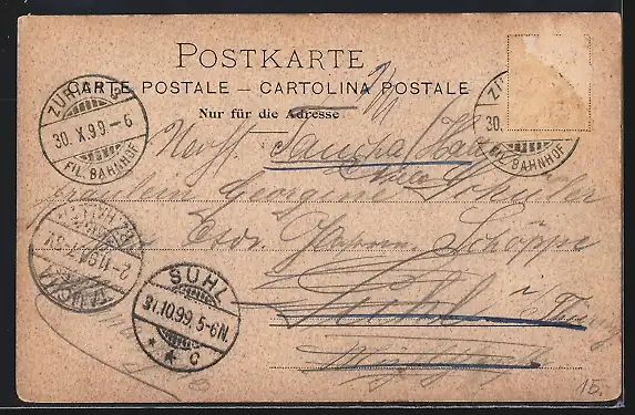 alte Ansichtskarte, gelaufen 1899, Briefmarke entfernt, rückseitig Oberflächenschaden, guter Zustand