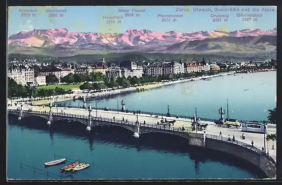 AK Zürich, Utoquai und Quaibrücke mit Strassenbahn, Alpenpanorama mit Bächistock, Drusberg und Pfannenstock