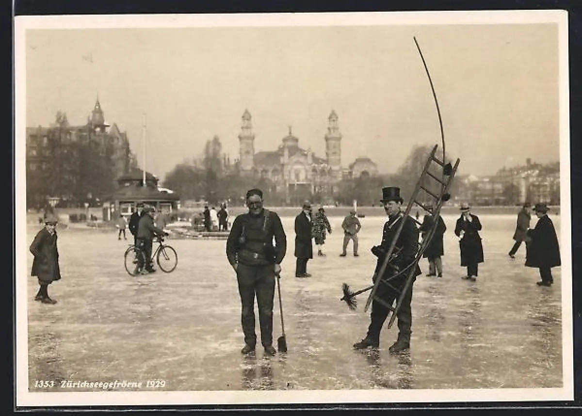 AK Zürich, Zürichseegefrörne 1929, Schornsteinfeger