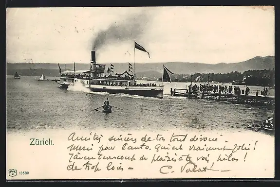 AK Zürich, abfahrender Dampfer am Hafen