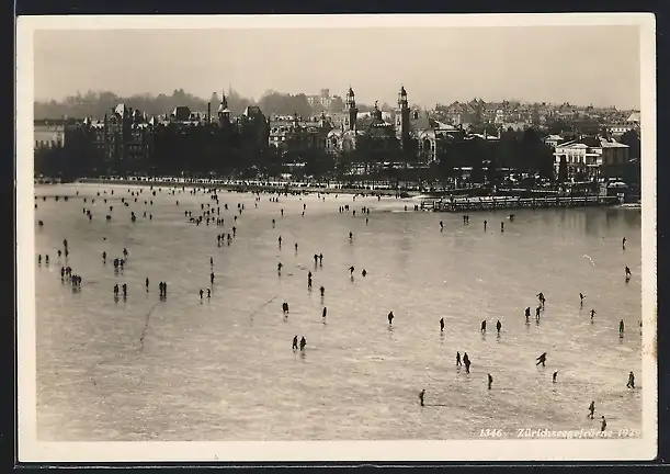 AK Zürich, zugefrorener Zürichsee mit Spaziergängern 1929 aus der Vogelschau