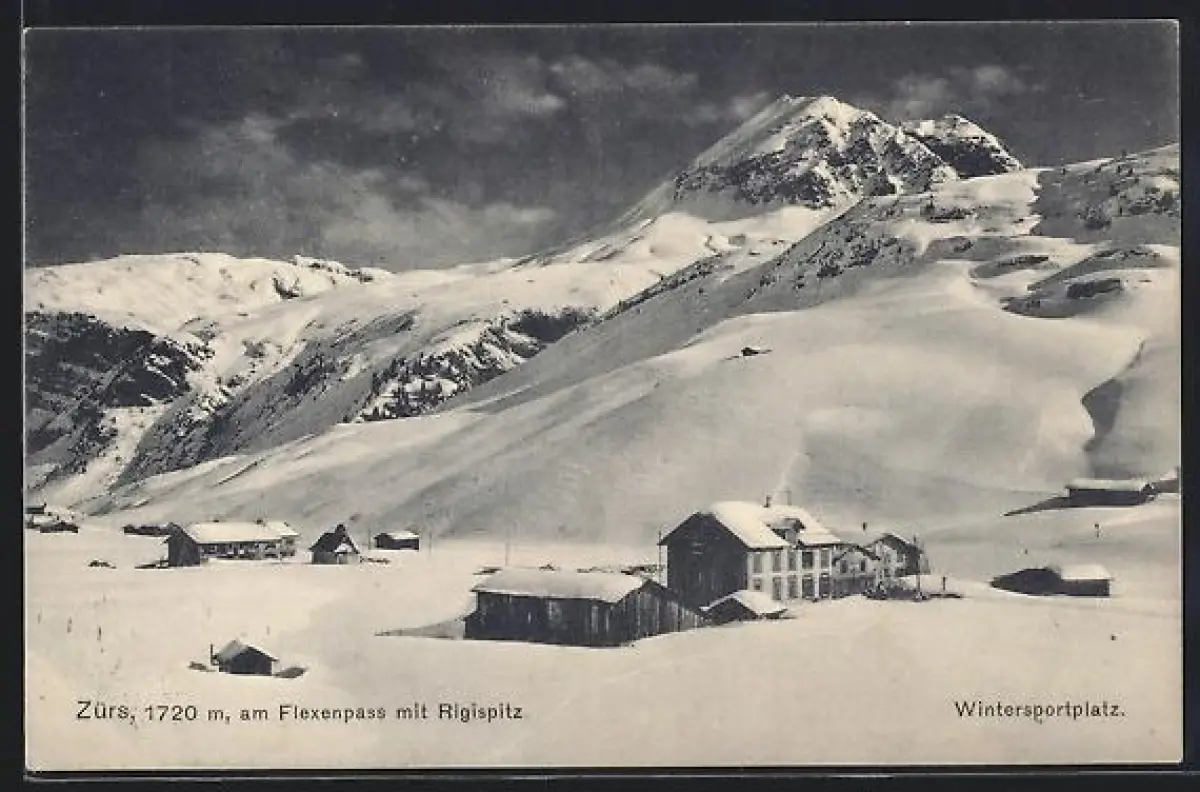AK Zürs, Ortsansicht im Winter, Flexenpass mit Rigispitz