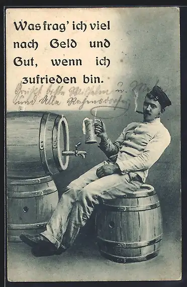 AK Zufriedener Soldat sitzt vorm Bierfass