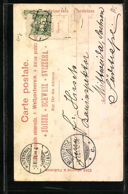 gelaufen 1901, Briefmarke tw. entfernt, rückseitig Oberflächenschaden, Eckknick li. oben, Bugspur li. oben, guter Zustand
