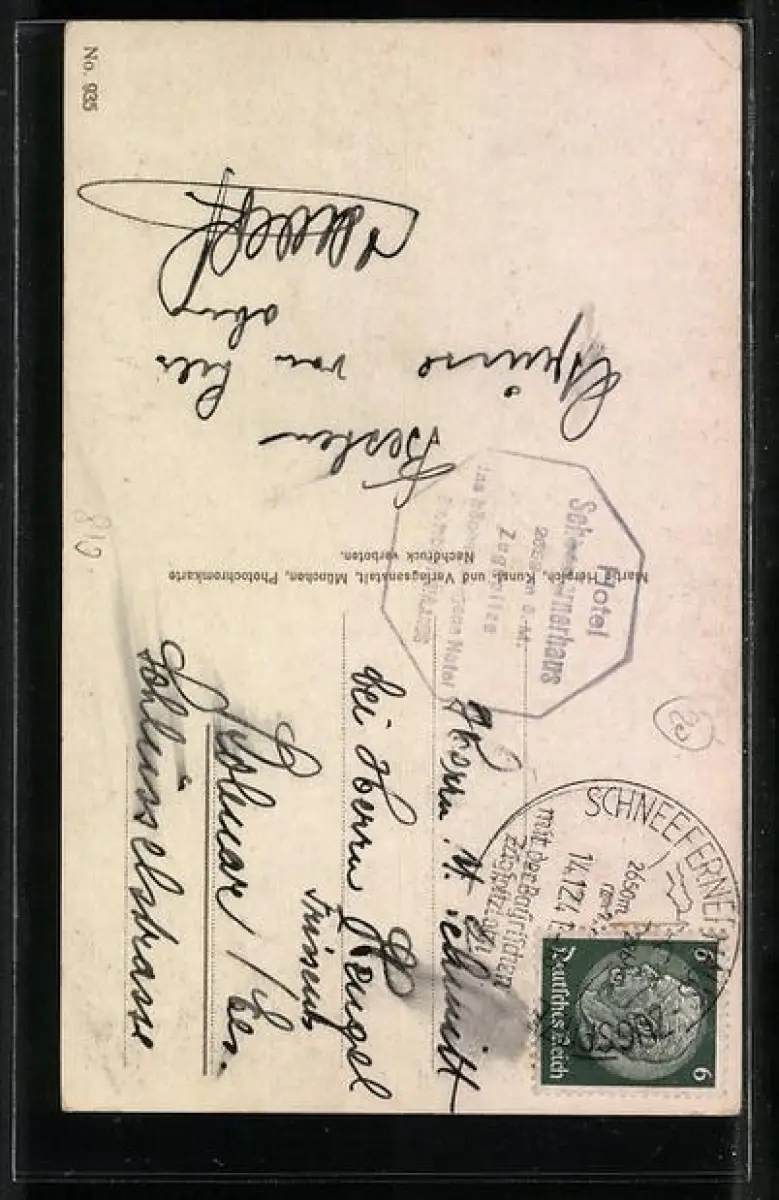 Personenbezogene Daten auf der Rückseite der Karte wurden durch blauen Textmarker unkenntlich gemacht. Die blauen Stellen sind auf die Vorderseite durchgeweicht und wirken sich negativ auf das Postkartenfoto aus
