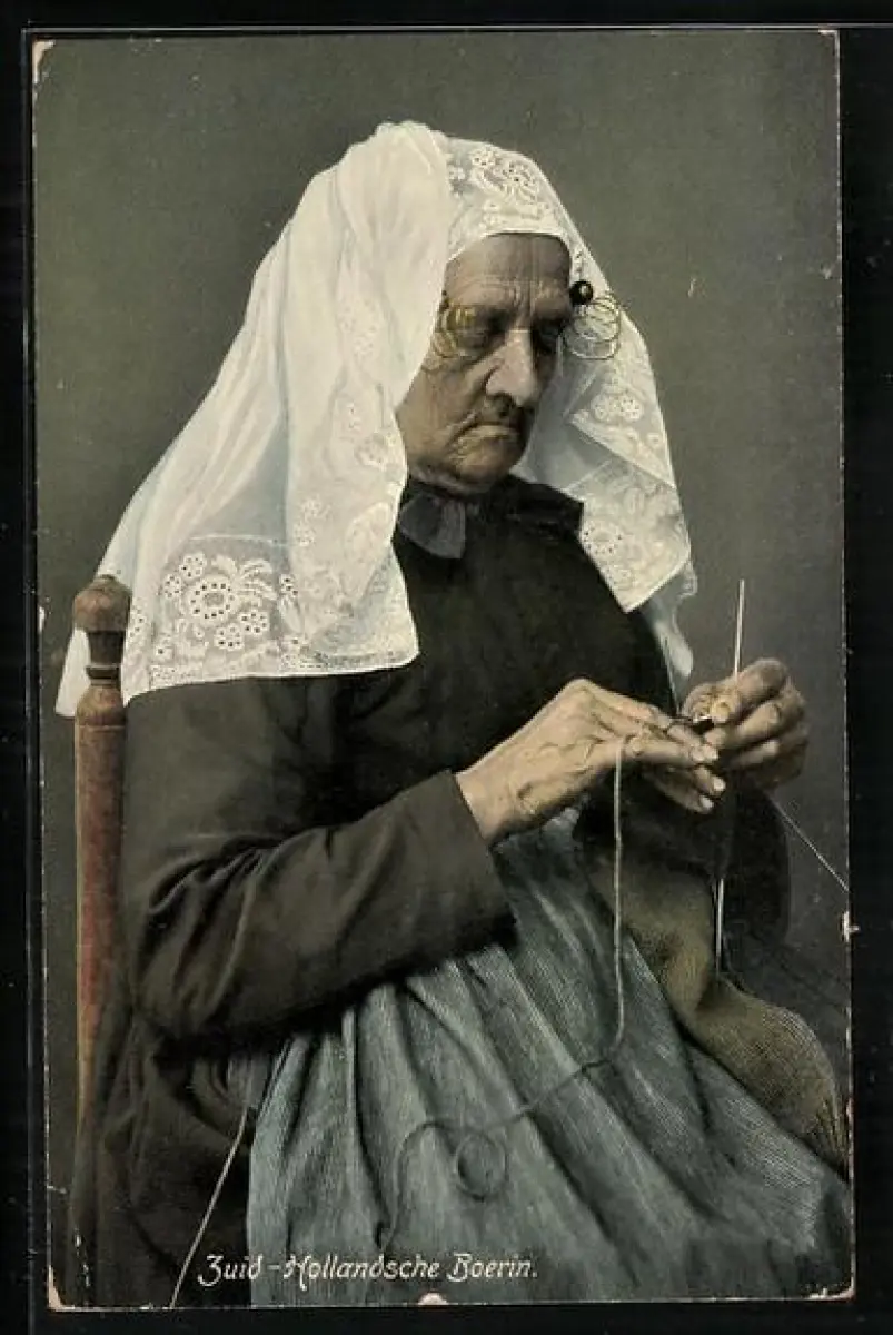 AK Zuid-Hollandische Boerin, Südholländische Bäuerin beim Stricken