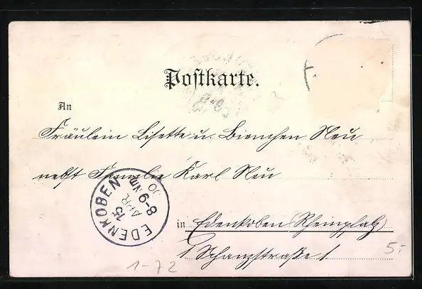 alte Ansichtskarte, gelaufen 1900, Briefmarke entfernt, rückseitig Oberflächenschaden, Eckknicke oben, guter Zustand