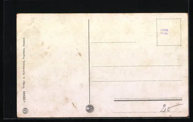 Personenbezogene Daten auf der Rückseite der Karte wurden durch blauen Textmarker unkenntlich gemacht. Die blauen Stellen sind auf die Vorderseite durchgeweicht und wirken sich negativ auf das Postkartenfoto aus