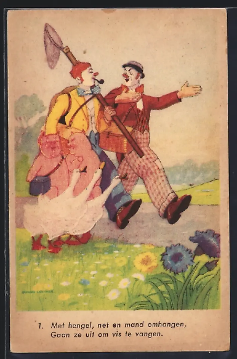 AK Zwei Clowns gehen mit Schweinen und Gänse spazieren