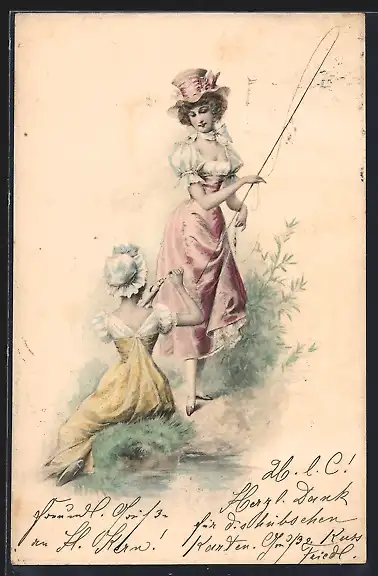 AK Zwei Damen in Sommerkleidern beim Angeln
