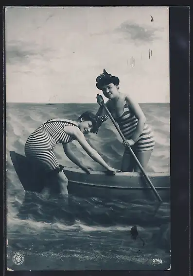 AK Zwei Frauen in Badeanzügen mit einem Ruderboot in der Fotokulisse