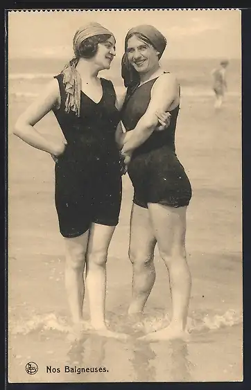 AK Zwei Frauen in Badeanzügen stehen am Strand