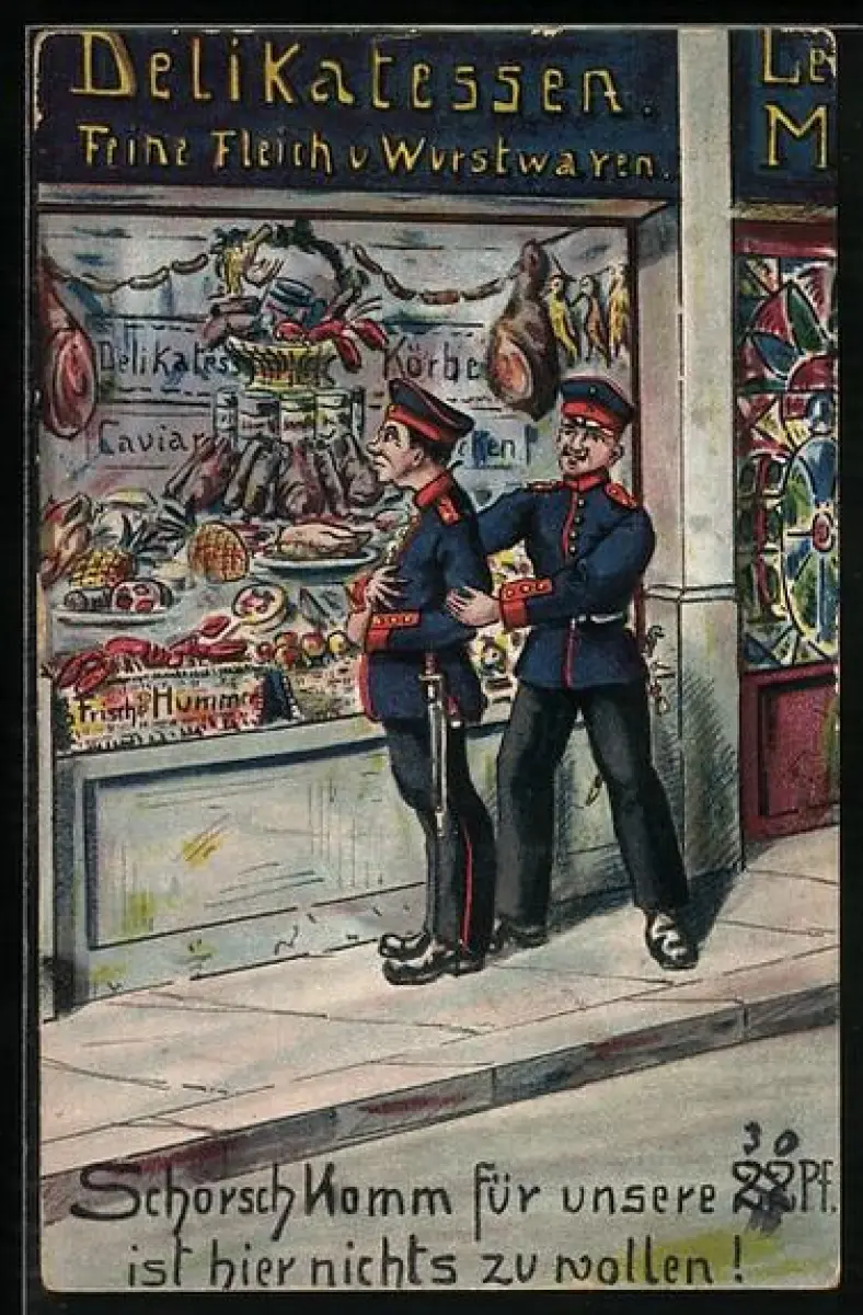 AK Zwei Infanterie-Soldaten vor einem Delikatessen-Geschäft