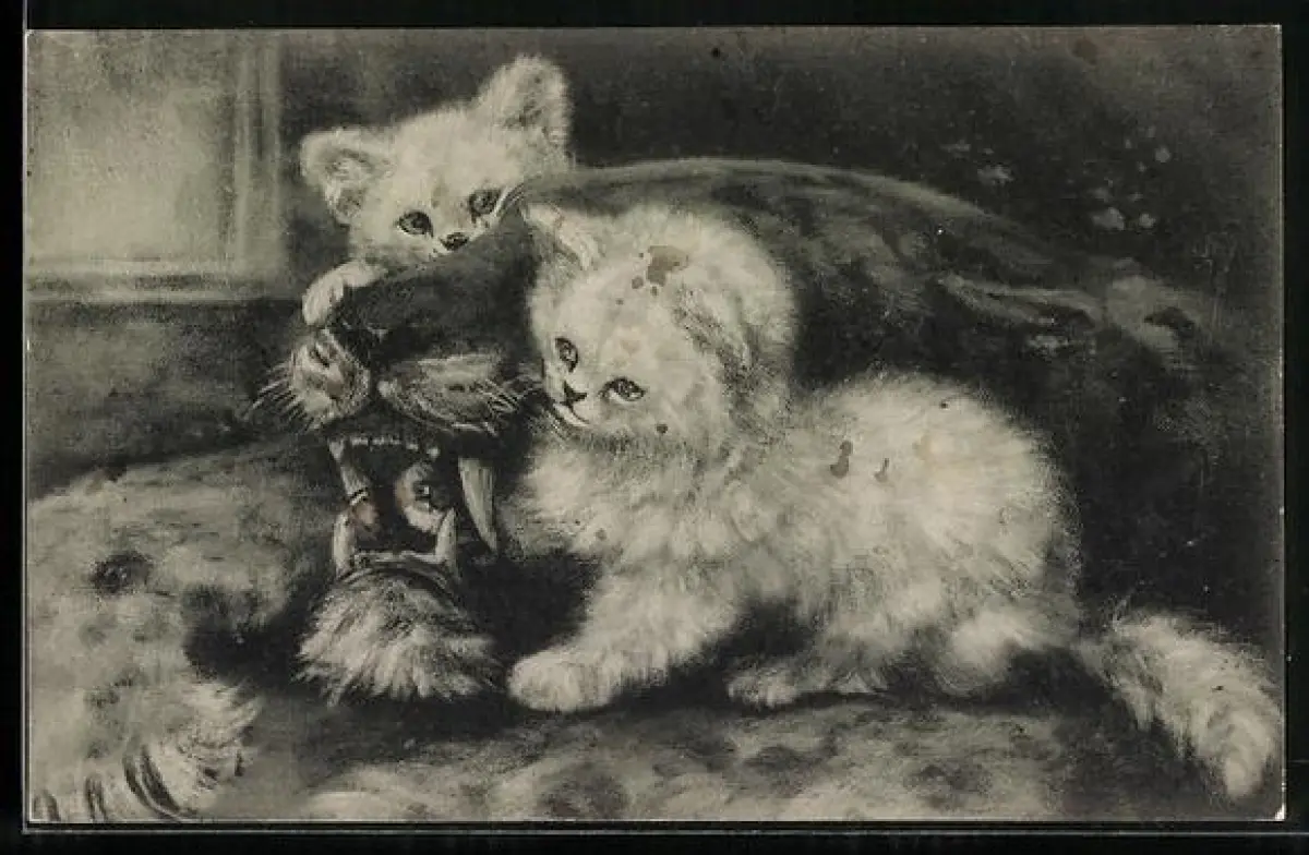 AK Zwei Kätzchen am Kopf eines Tigerfells