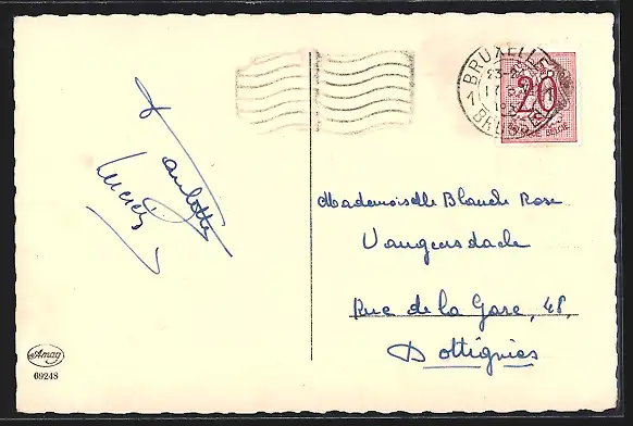 Personenbezogene Daten auf der Rückseite der Karte wurden durch blauen Textmarker unkenntlich gemacht. Die blauen Stellen sind auf die Vorderseite durchgeweicht und wirken sich negativ auf das Postkartenfoto aus