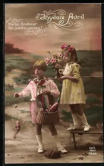 AK Zwei Kinder mit Angel und Fischen, Joyeux Avril