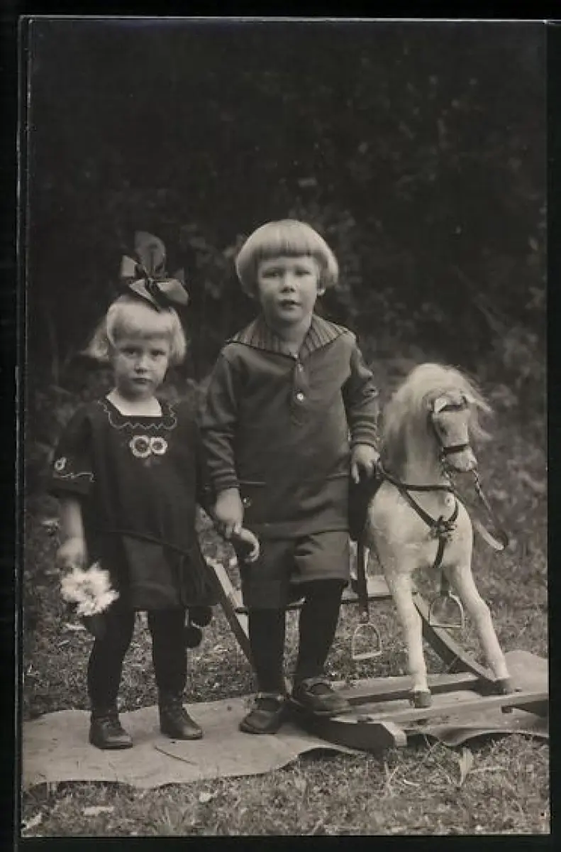 AK Zwei Kinder mit ihrem Schaukelpferd