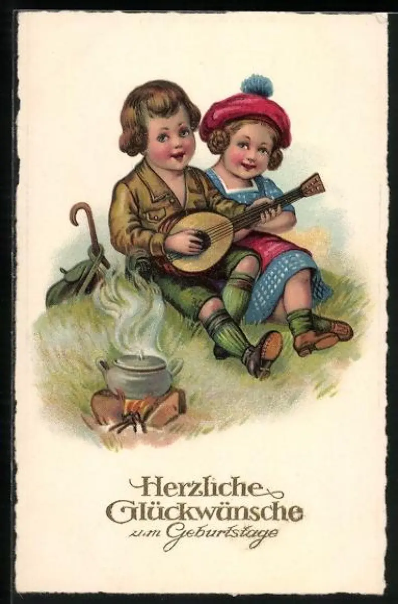AK Zwei Kinder sitzen auf einer Wiese mit einer Laute