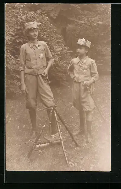 AK Zwei Knaben in Uniform mit Knickerbockern mit Ausrüstung