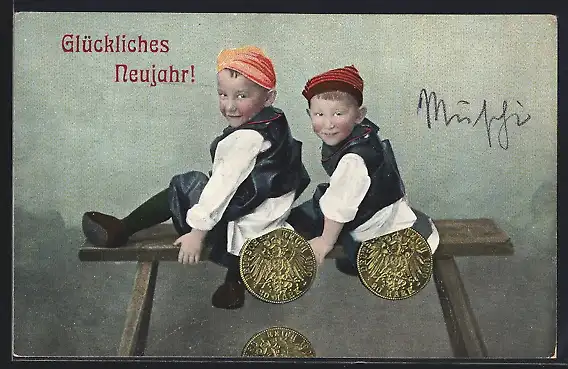 AK Zwei Knaben mit 20 Mark Goldmünzen am Hinterteil, Neujahrsgruss