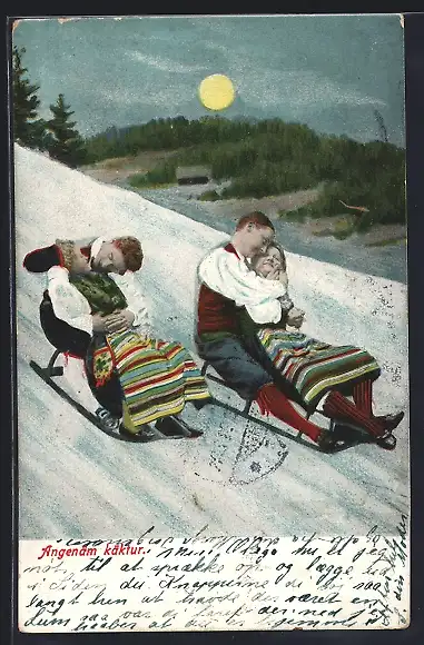 AK Zwei Liebespaare auf Schlitten bei Mondschein