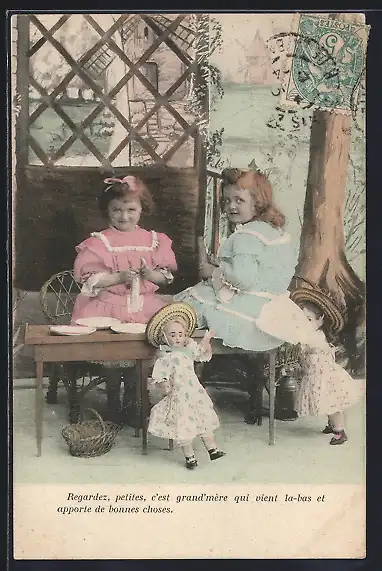 AK Zwei Mädchen an einem Tisch sitzend mit zwei Puppen