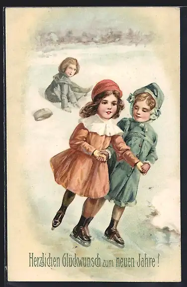 AK Zwei Mädchen fahren elegant Schlittschuh, ein Knabe liegt dahinter auf dem Eis