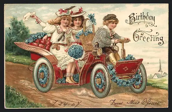 AK Zwei Mädchen mit Chauffeur in ein mit Vergissmeinnicht geschmücktem Auto