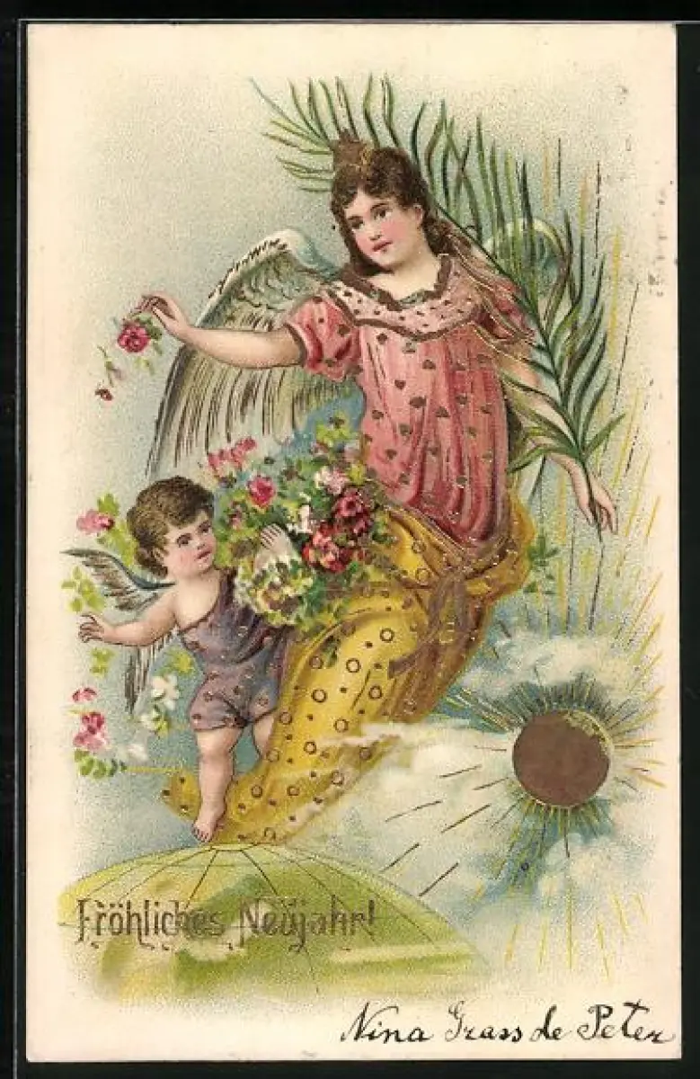 AK Zwei Neujahrsengel mit Palmenzweig und Blumen, Fröhliches Neujahr