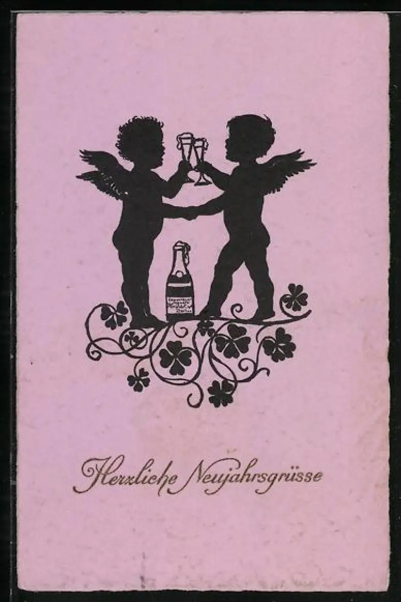 AK Zwei Neujahrsengel stossen mit Sekt an, Herzliche Neujahrsgrüsse