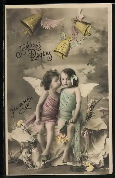 AK Zwei Osterengel unter fliegenden Glocken, Joyeuses Paques