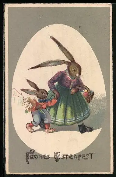 AK Zwei Osterhasen mit Ostereiern und Weidenkätzchen, Frohes Osterfest
