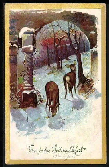AK Zwei Rehe unter einem Torbogen im Schnee, Weihnachtsgruss