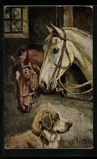 AK Zwei Reitpferde mit Hund im Stall