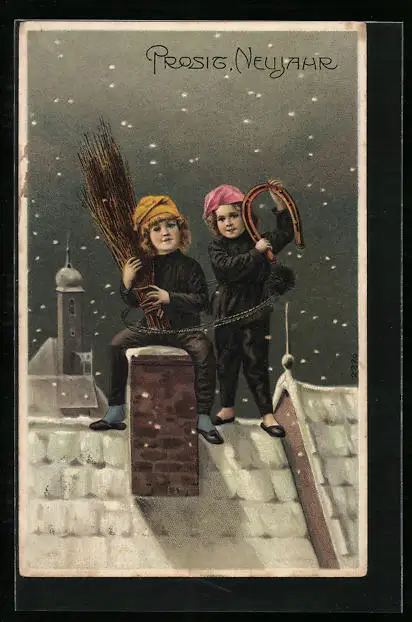 AK Zwei Schornsteinfeger auf dem Dach mit Hufeisen