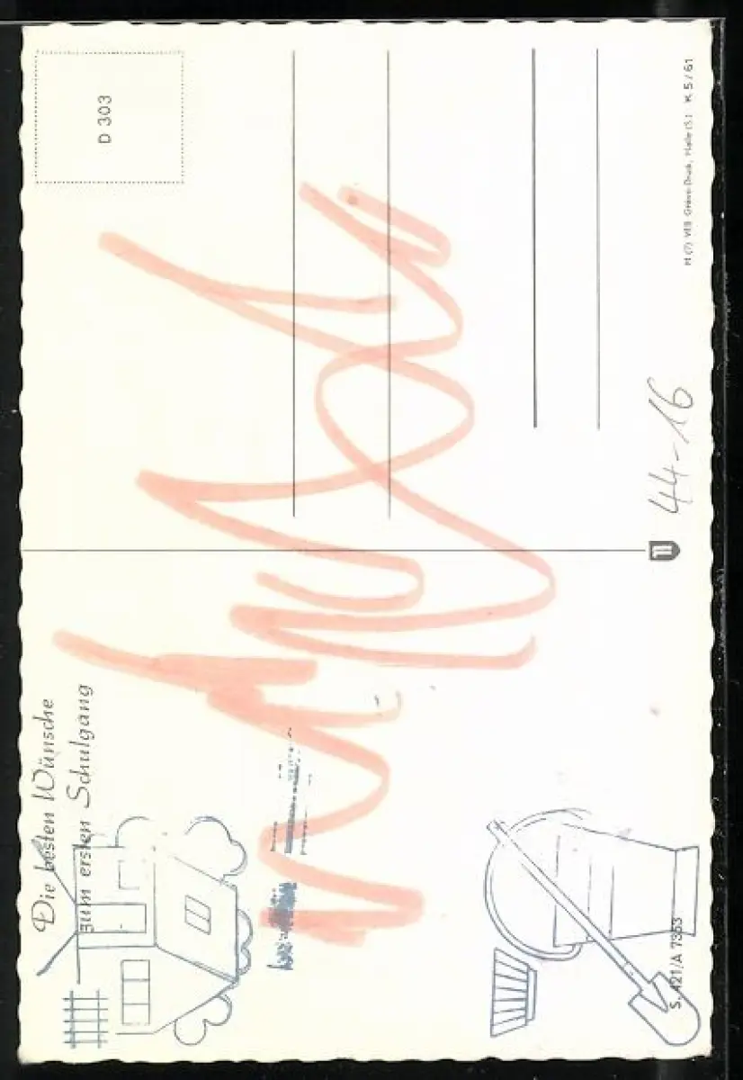Personenbezogene Daten auf der Rückseite der Karte wurden durch blauen Textmarker unkenntlich gemacht. Die blauen Stellen sind auf die Vorderseite durchgeweicht und wirken sich negativ auf das Postkartenfoto aus