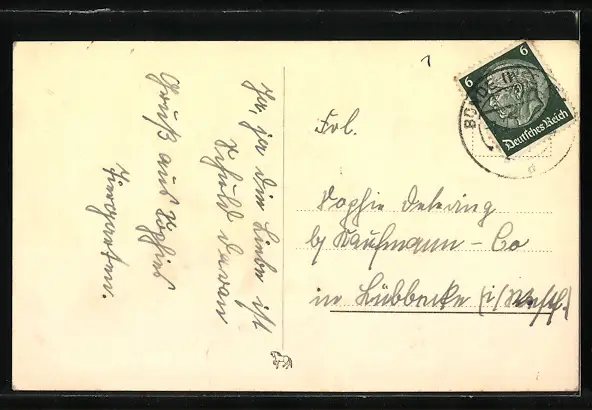 Personenbezogene Daten auf der Rückseite der Karte wurden durch blauen Textmarker unkenntlich gemacht. Die blauen Stellen sind auf die Vorderseite durchgeweicht und wirken sich negativ auf das Postkartenfoto aus