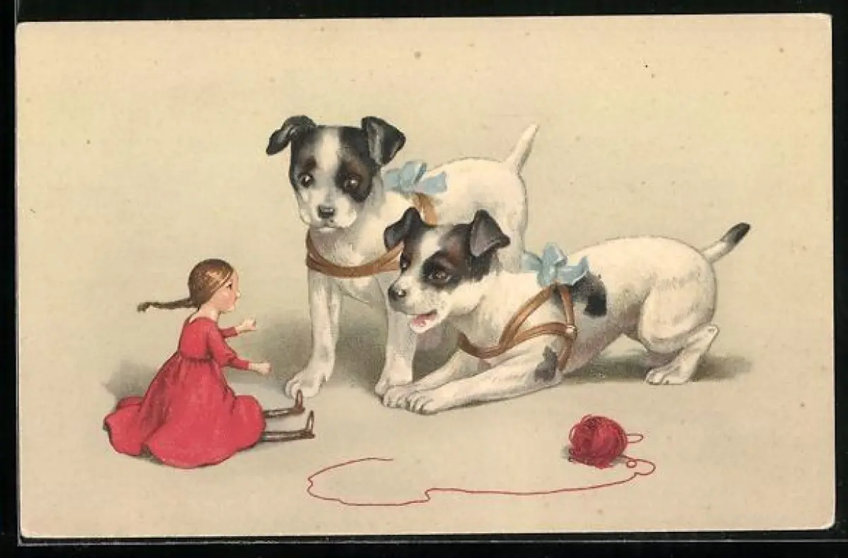 AK Zwei Terrier spielen mit einer Puppe