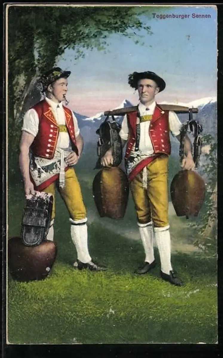 AK Zwei Toggenburger Sennen mit grossen Kuhglocken