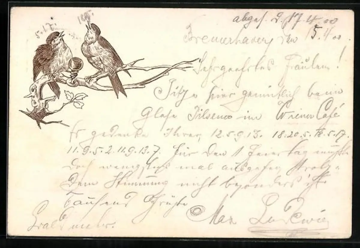 AK Zwei Vögel auf einem Ast mit Weinglas