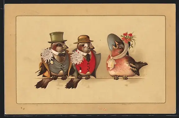 AK Zwei Vogel-Kavaliere machen einer Dame ihre Aufwartung