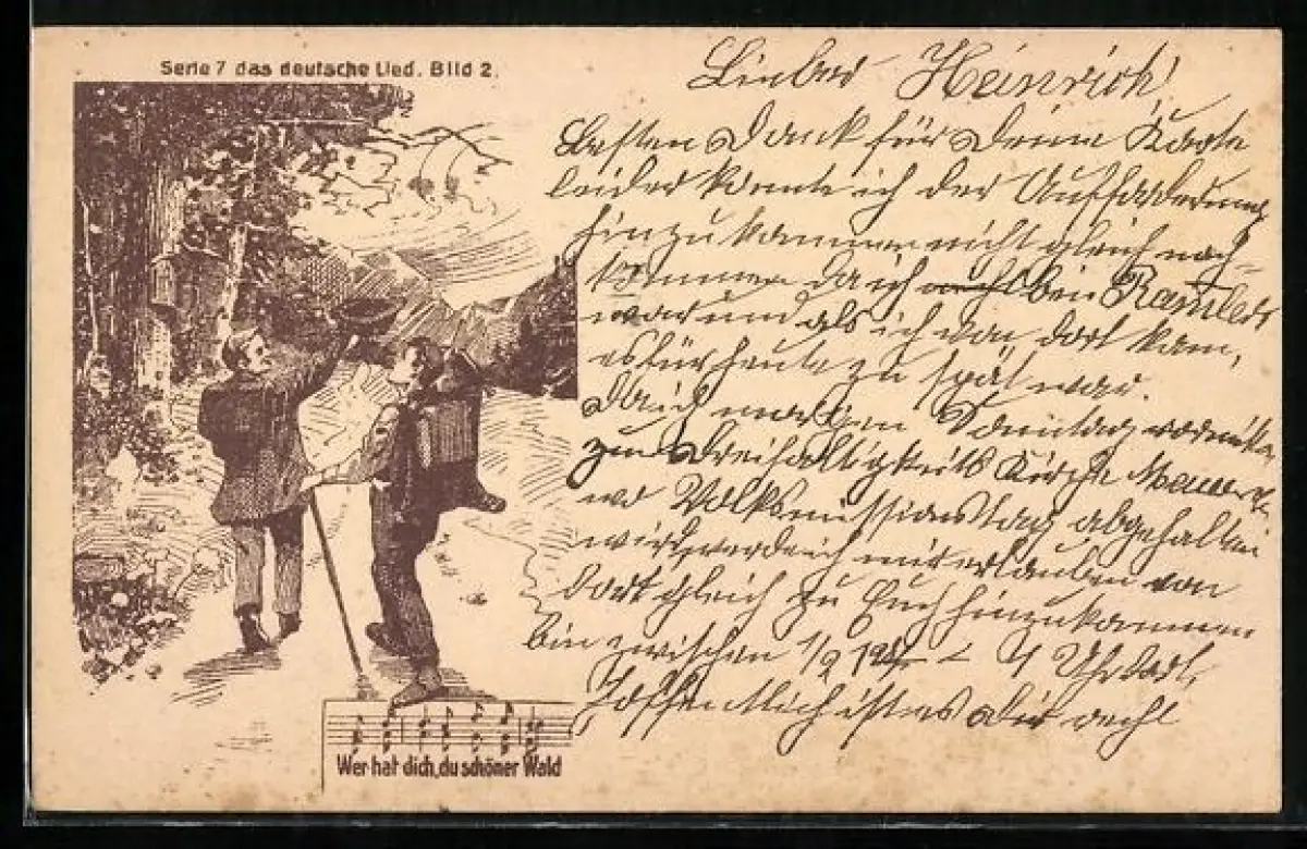 AK Zwei Wandervögel in den Bergen, Wer hat dich, du schöner Wald, Lied mit Noten