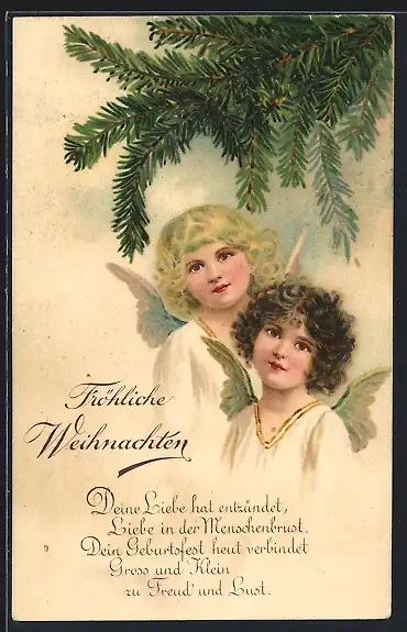 AK Zwei Weihnachtsengel unter einem Tannenzweig