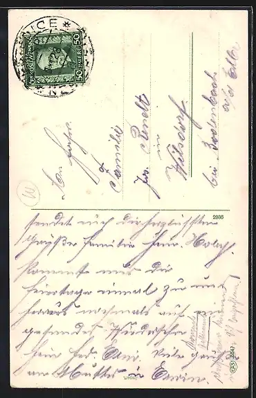 Personenbezogene Daten auf der Rückseite der Karte wurden durch blauen Textmarker unkenntlich gemacht. Die blauen Stellen sind auf die Vorderseite durchgeweicht und wirken sich negativ auf das Postkartenfoto aus