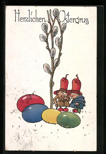 AK Zwei Zwerge mit Weidenkätzchen und Ostereiern