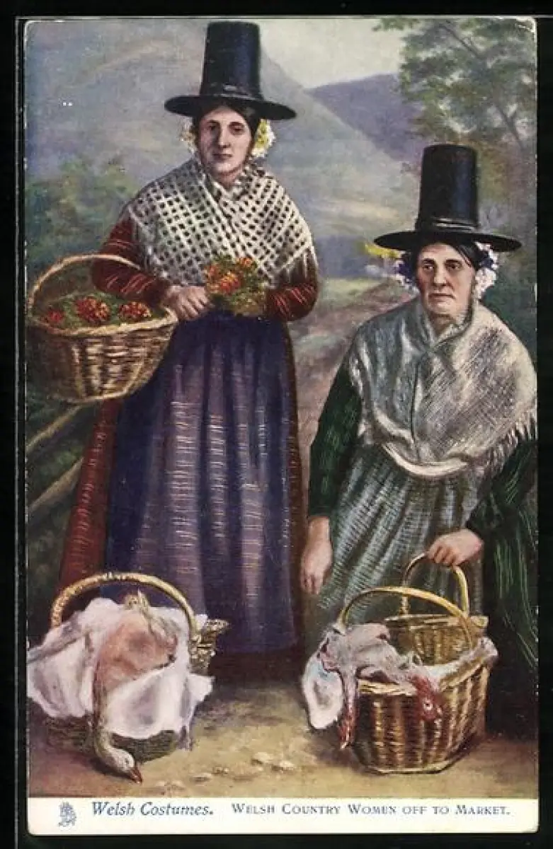 AK Zwei alte walisische Frauen in volkstypischen Trachten gehen zum Markt
