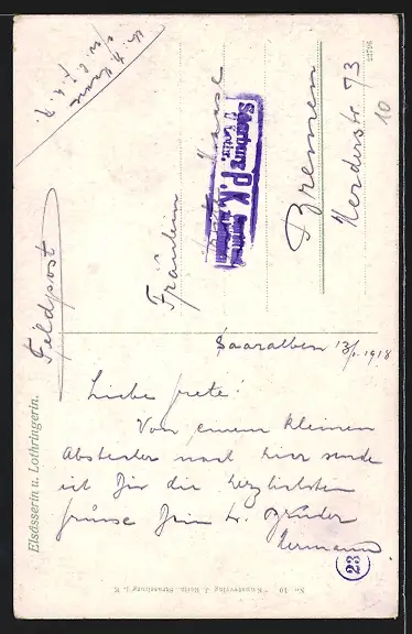 Personenbezogene Daten auf der Rückseite der Karte wurden durch blauen Textmarker unkenntlich gemacht. Die blauen Stellen sind auf die Vorderseite durchgeweicht und wirken sich negativ auf das Postkartenfoto aus