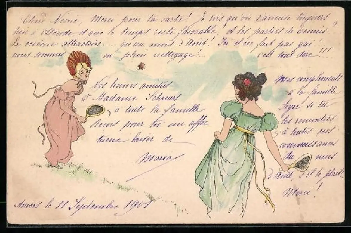 AK Zwei junge Frauen in Kleidern bei Federballspiel, Jugendstil